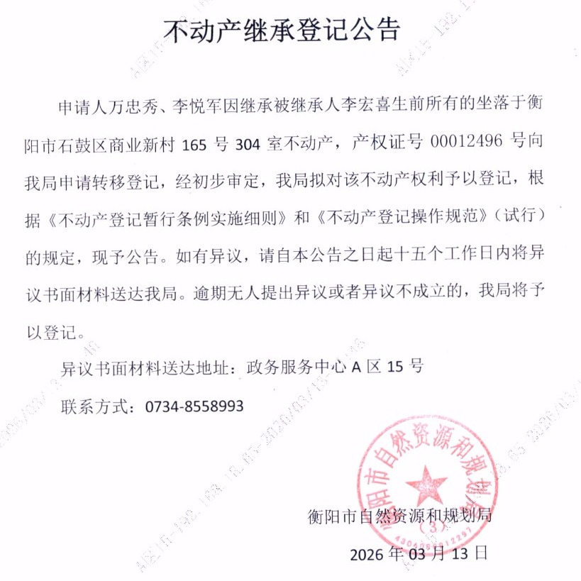 关于万忠秀、李悦军继承李宏喜不动产登记的公告