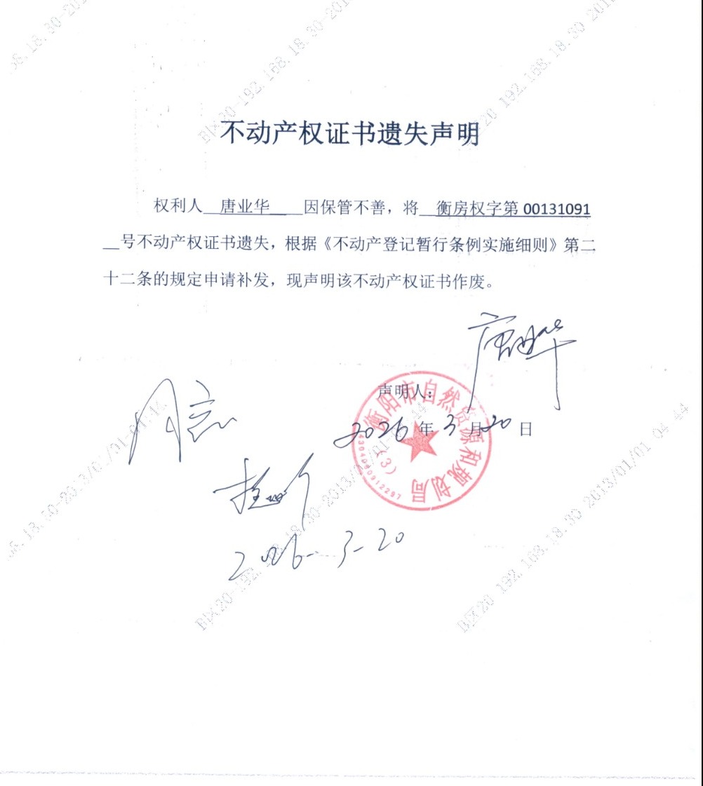 关于唐业华不动产权证书遗失的公告