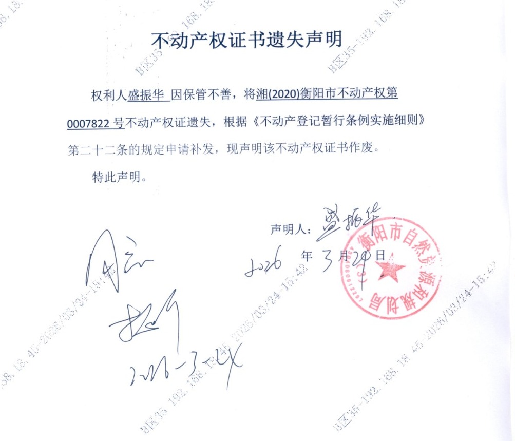 关于盛振华不动产权证书遗失声明