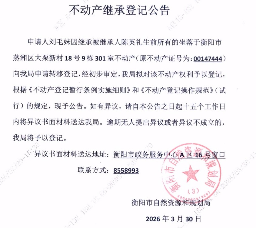 关于刘毛妹继承陈英礼不动产登记的公告