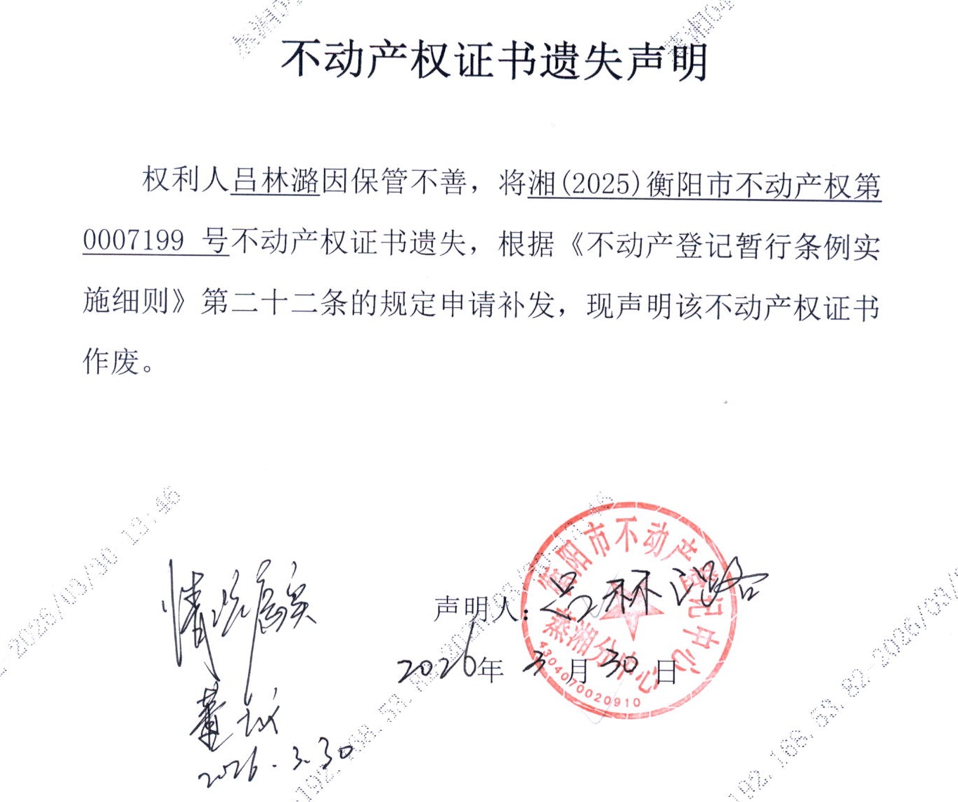 关于吕林潞不动产权证书遗失声明