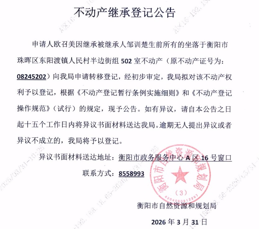 关于欧召美继承邹训楚不动产登记的公告
