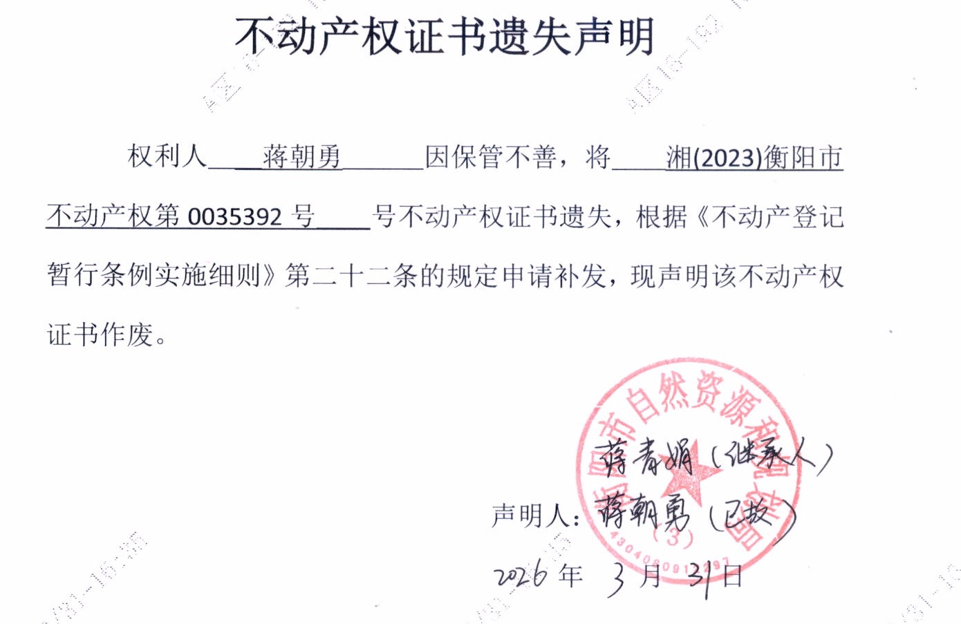 关于蒋朝勇不动产权证书遗失声明的公告
