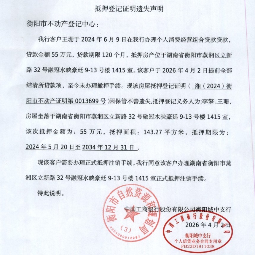关于中国工商银行股份有限公司衡阳城中支行不动产登记证明遗失的声明