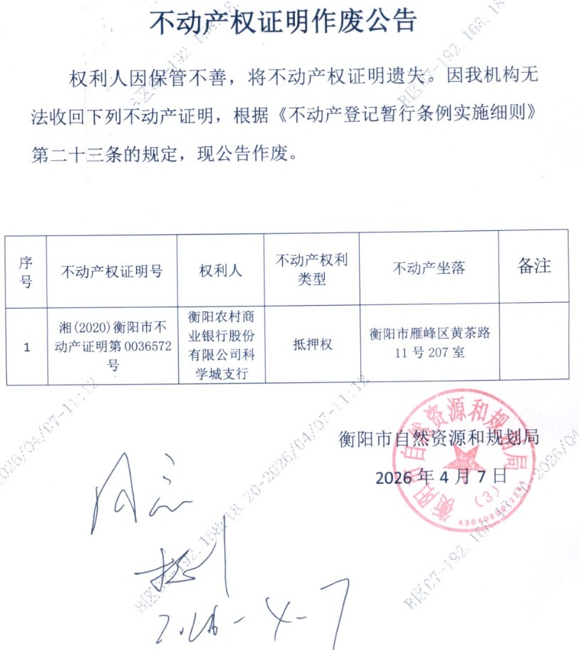 关于衡阳农村商业银行股份有限公司科学城支行不动产权证明作废公告