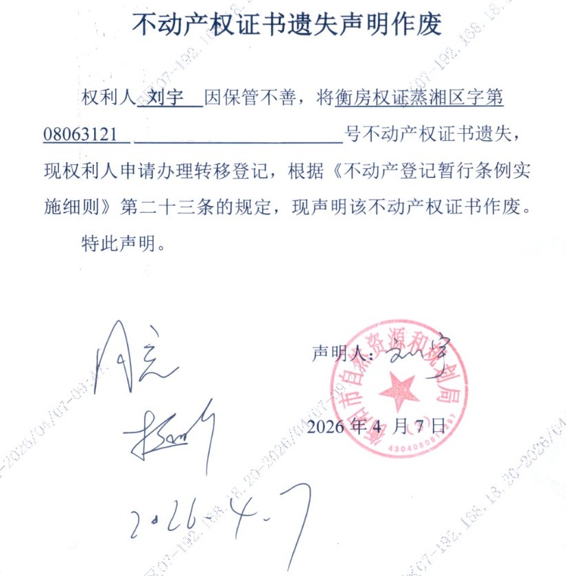 关于刘宇房产证遗失声明作废公告