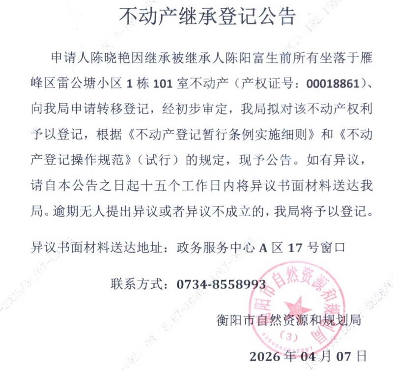 关于陈晓艳继承陈阳富不动产登记的公告
