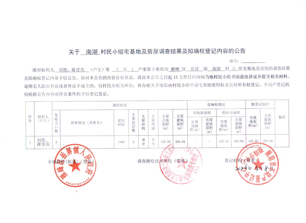 关于南湖村村民刘艳、蒋受英宅基地及房屋调查结果及拟确权登记内容的公告