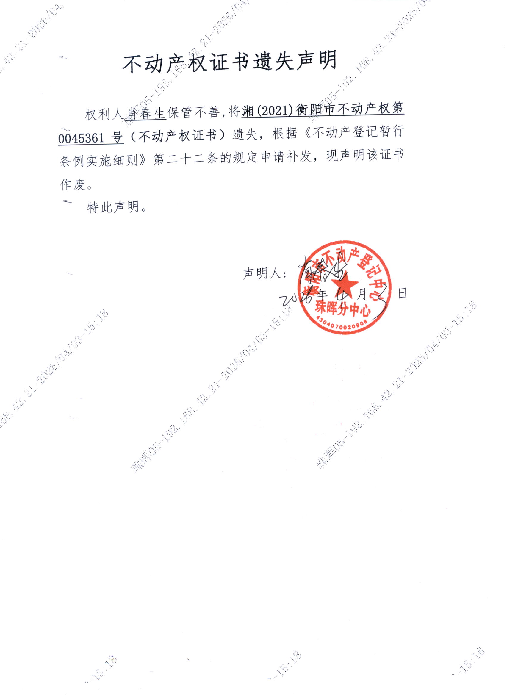 关于肖春生不动产权证书遗失声明公告