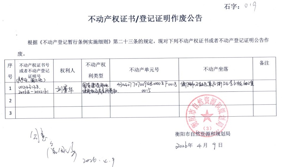 关于刘曼华的房产证、国土证作废公告