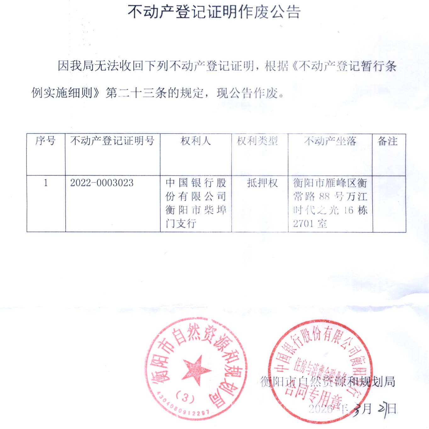 关于中国银行股份有限公司衡阳市柴埠门支行不动产登记证明作废的公告
