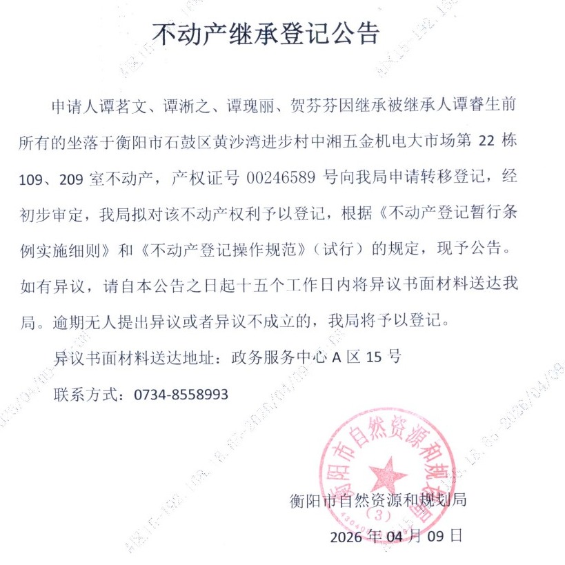 关于谭苕文、谭淅之、谭瑰丽、贺芬芬继承谭睿不动产登记的公告