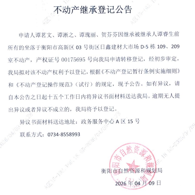 关于谭苕文、谭淅之、谭瑰丽、贺芬芬继承谭睿不动产登记的公告