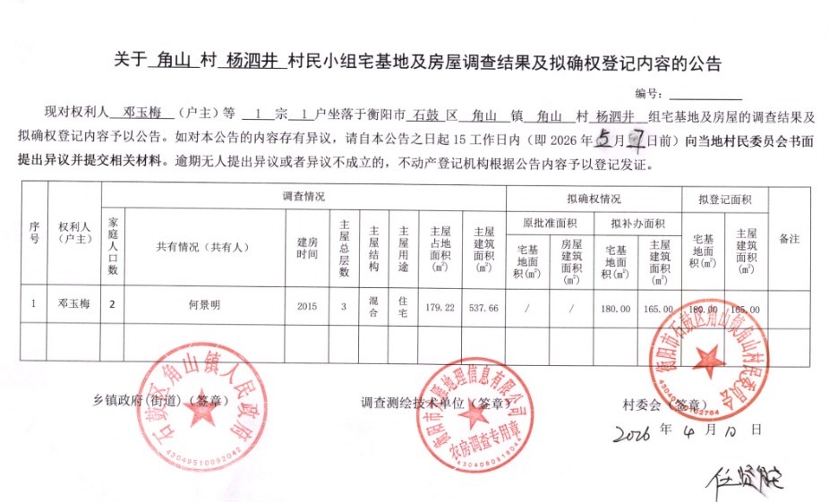 关于角山村杨泗井村民小组宅基地及房屋调查结果及拟确权登记内容的公告
