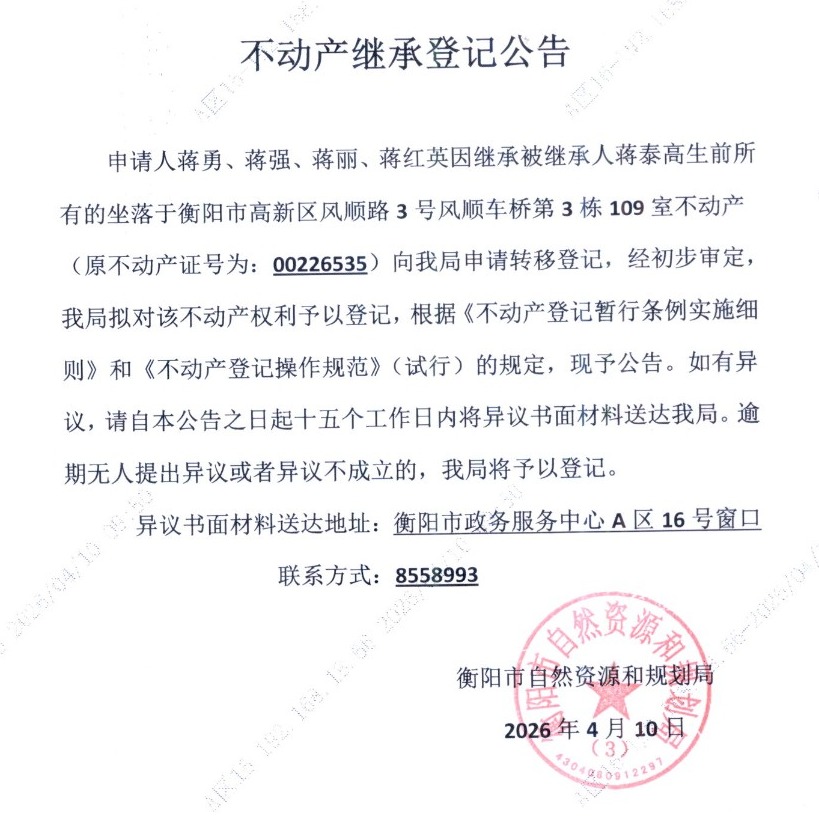 关于蒋勇、蒋强、蒋丽、蒋红英继承蒋泰高不动产公告