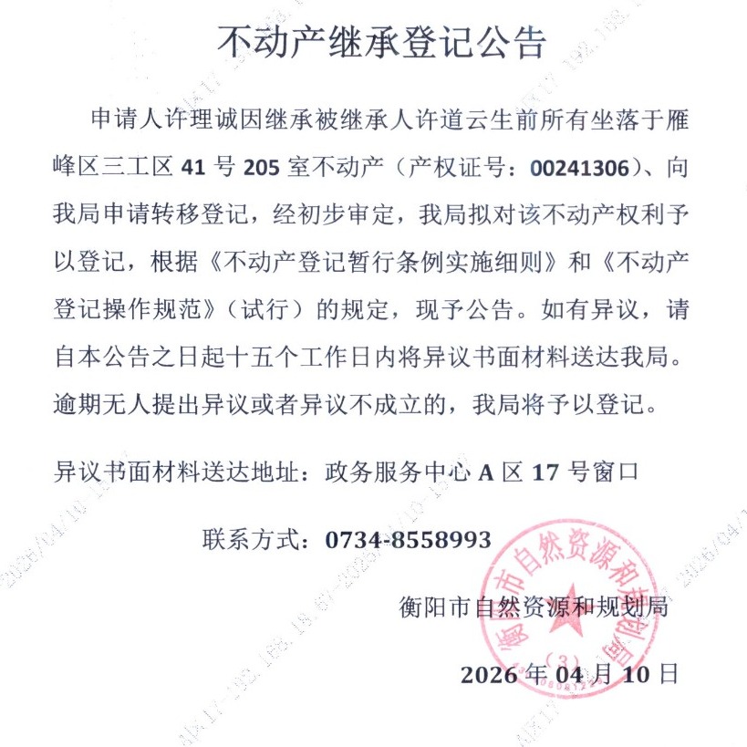 关于许理诚继承许道云不动产登记的公告