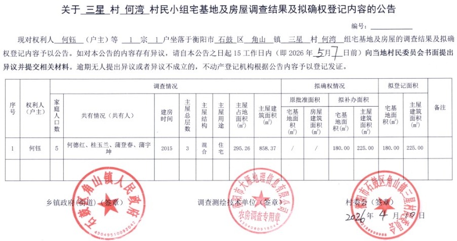 关于三星村何湾村民小组宅基地及房屋调查结果及拟确权登记内容的公告