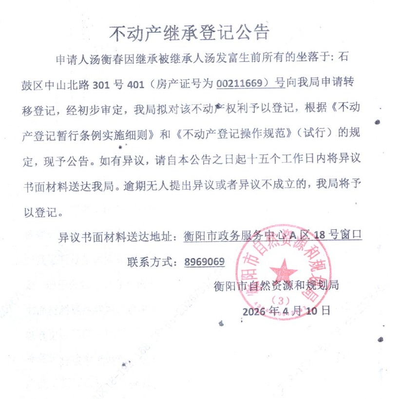 关于汤衡春继承汤发富不动产登记的公告
