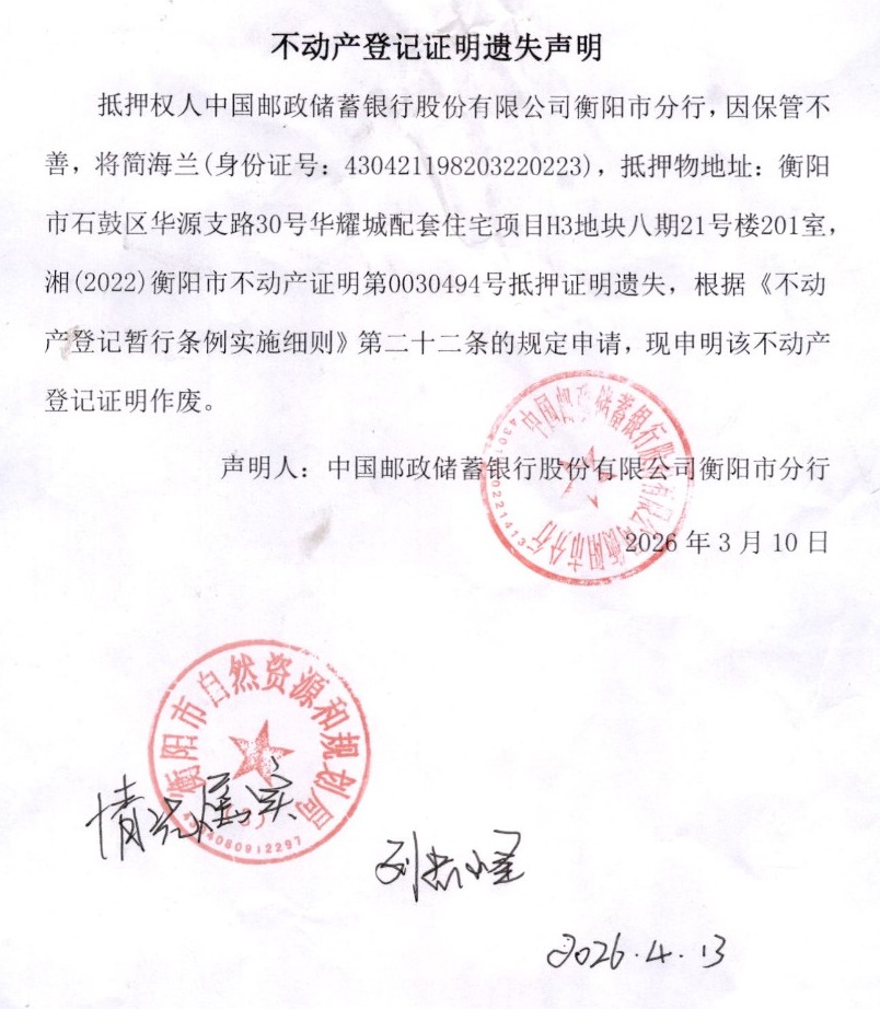 关于中国邮政储蓄银行股份有限公司衡阳市分行不动产登记证明遗失作废声明的公告