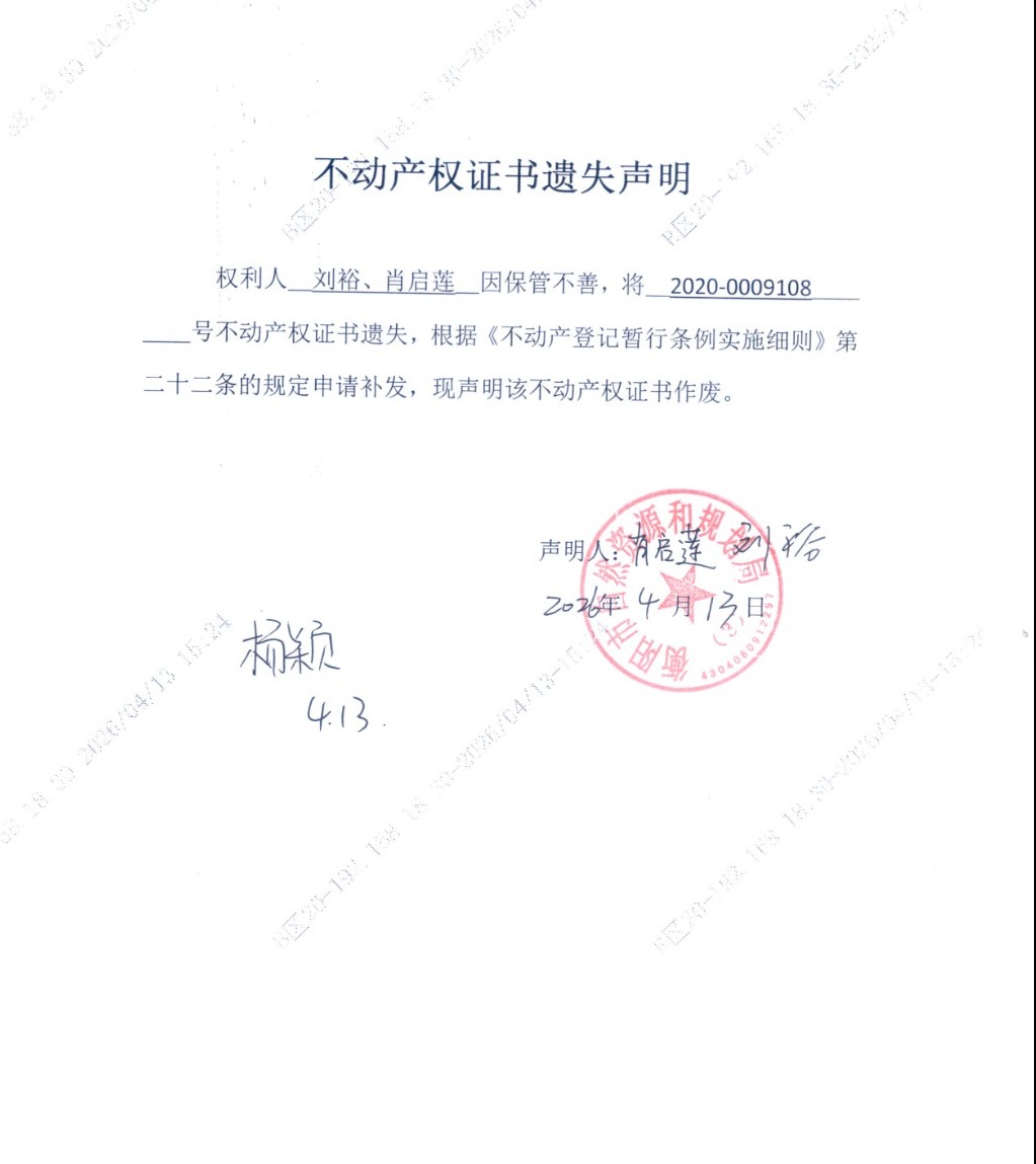 关于刘裕、肖启莲不动产权证书遗失的公告