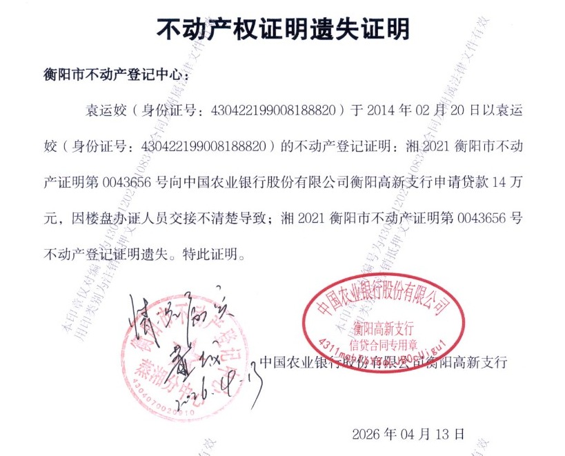 关于中国农业银行股份有限公司衡阳高新支行不动产登记证明遗失作废声明的公告