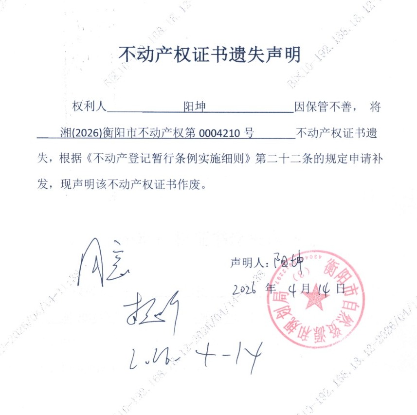 关于阳坤不动产权证书遗失声明