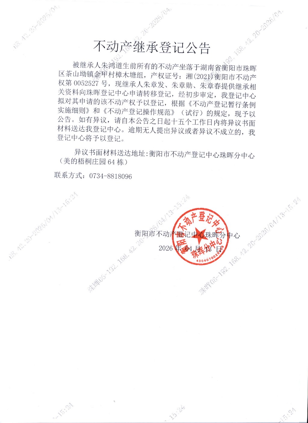 关于朱章发、朱章勋、朱章春继承朱鸿道不动产登记的公告