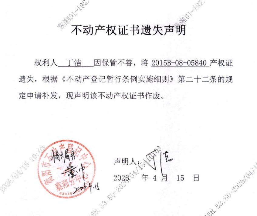 关于丁洁国土证遗失的公告