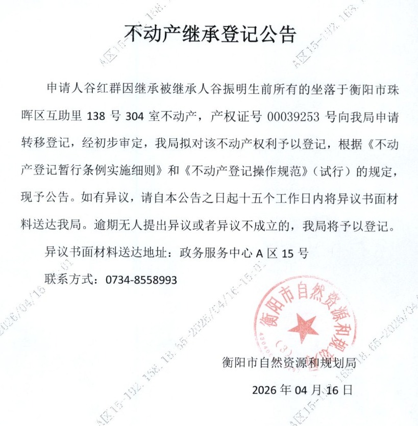 关于谷红群继承谷振明不动产登记的公告