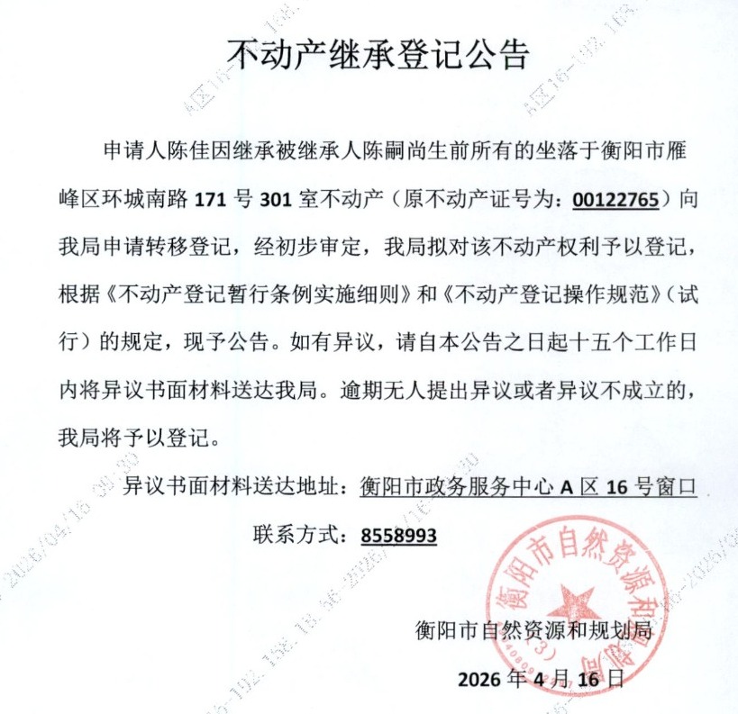 关于陈佳继承陈嗣尚不动产登记的公告