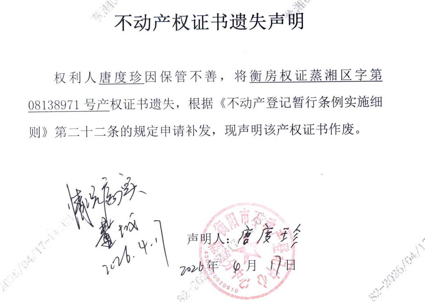 关于唐度珍不动产证书遗失声明公告