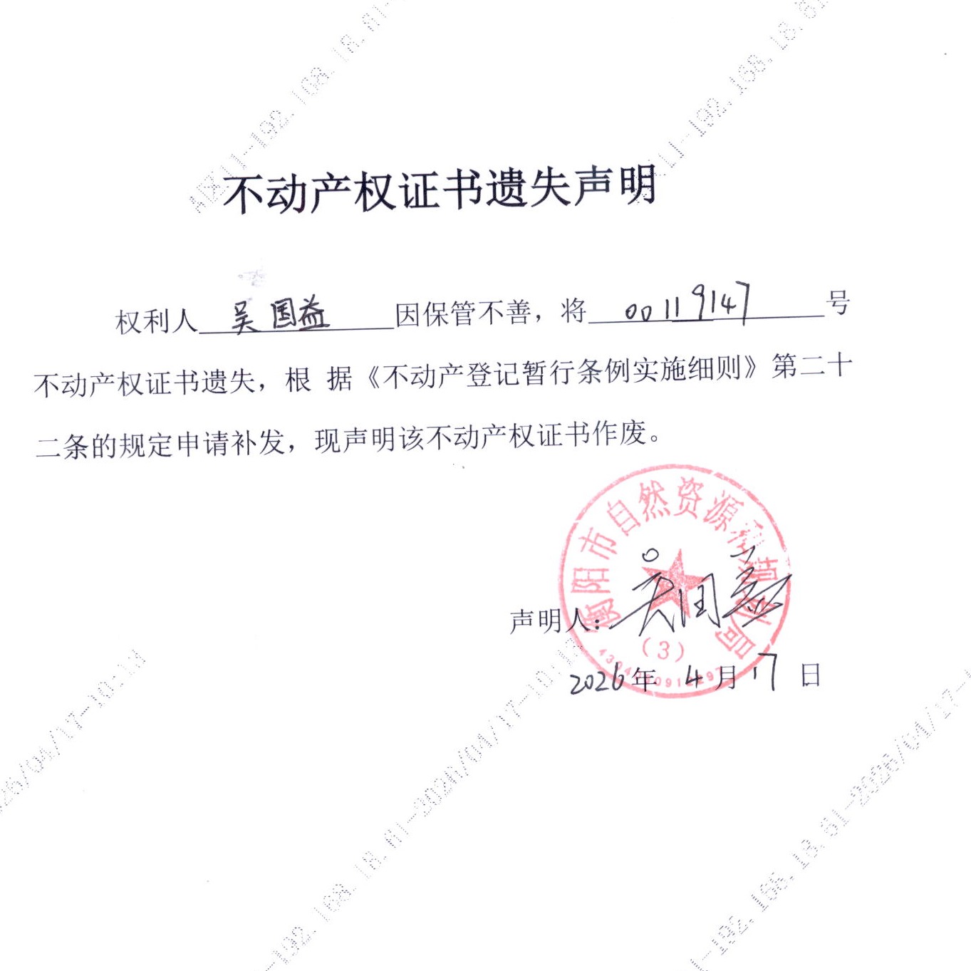 关于吴国益不动产权证书遗失的声明