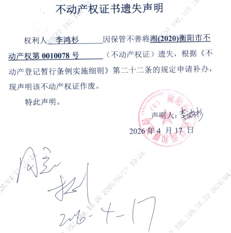 关于李鸿杉不动产权证书遗失声明公告