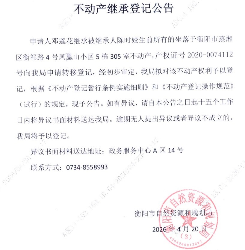 关于邓莲花继承陈时姣不动产登记的公告