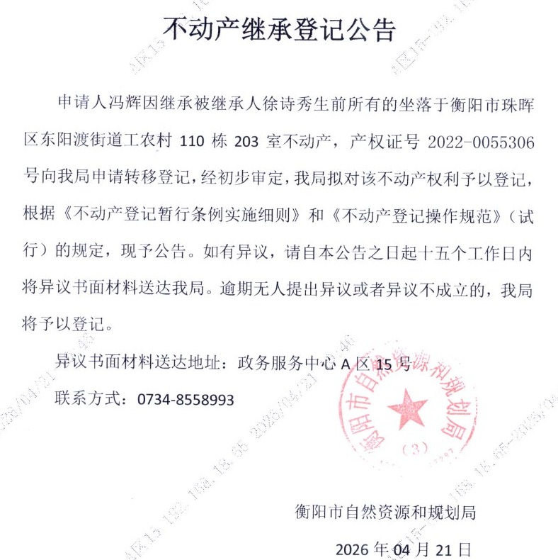 关于冯辉继承徐诗秀不动产登记的公告