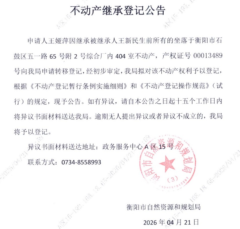关于王娅萍继承王新民不动产登记的公告