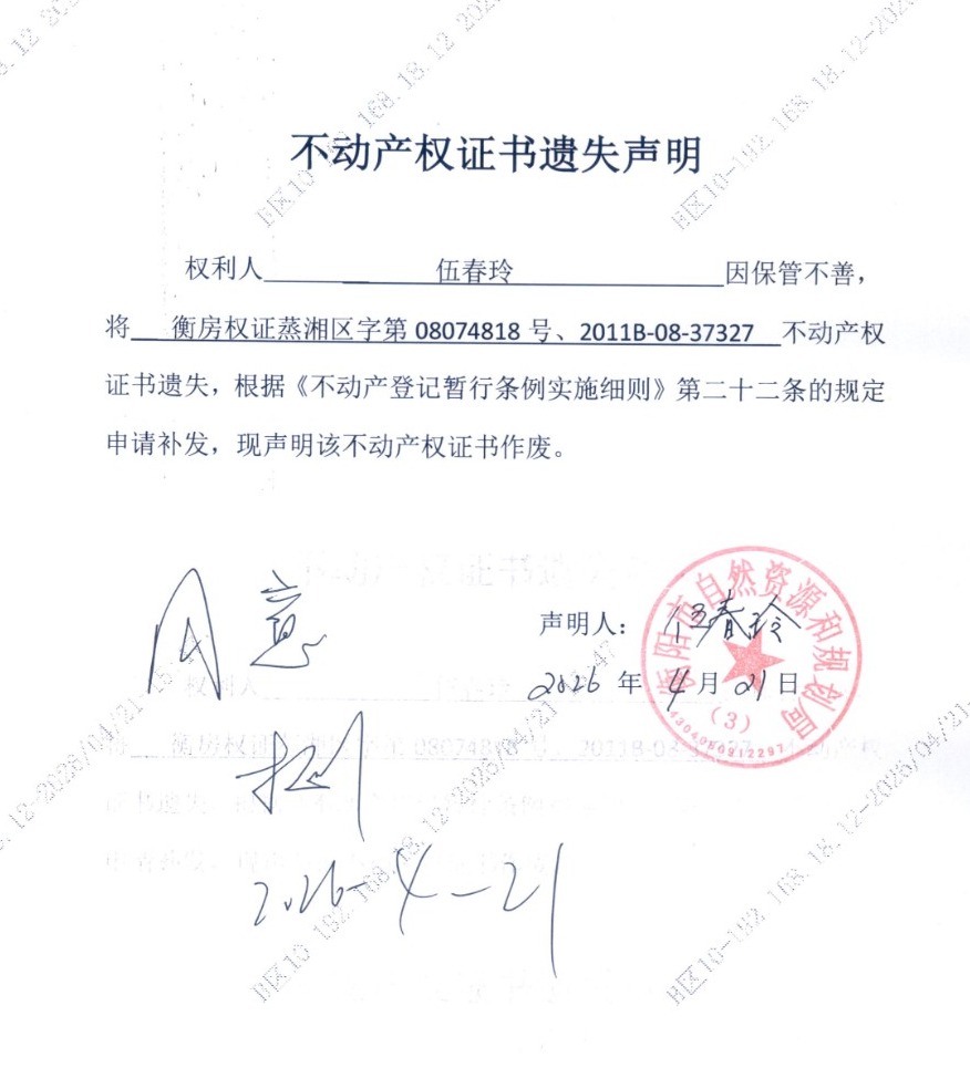 关于伍春玲不动产权证书遗失声明