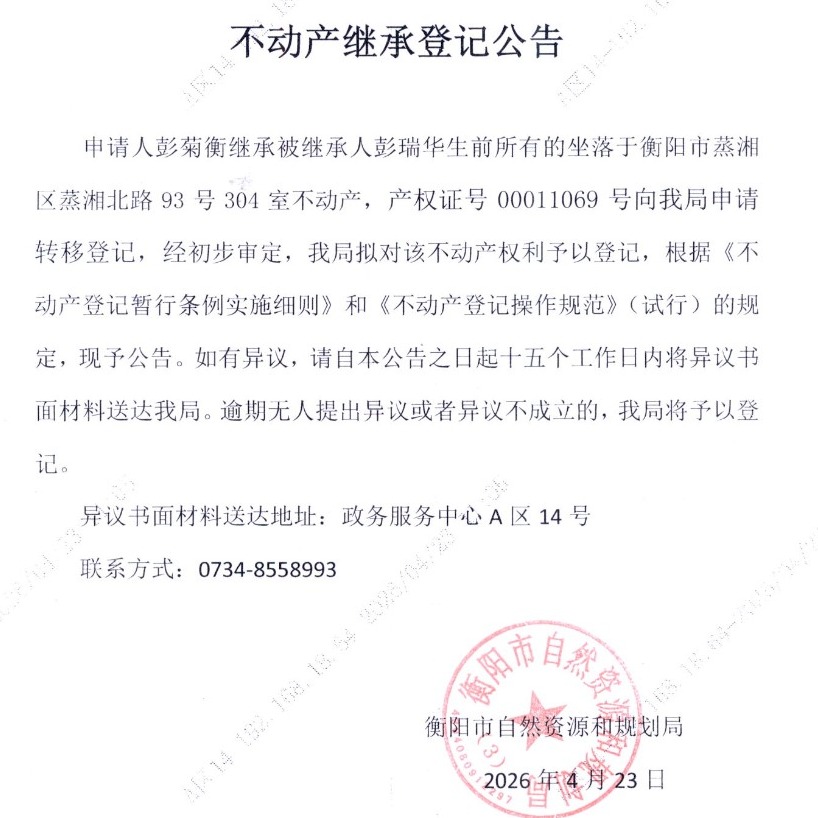 关于彭菊衡继承彭瑞华不动产登记的公告