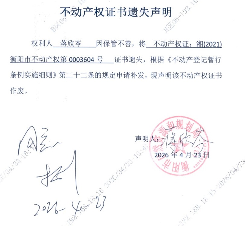 关于蒋欣岑不动产权证书遗失公告