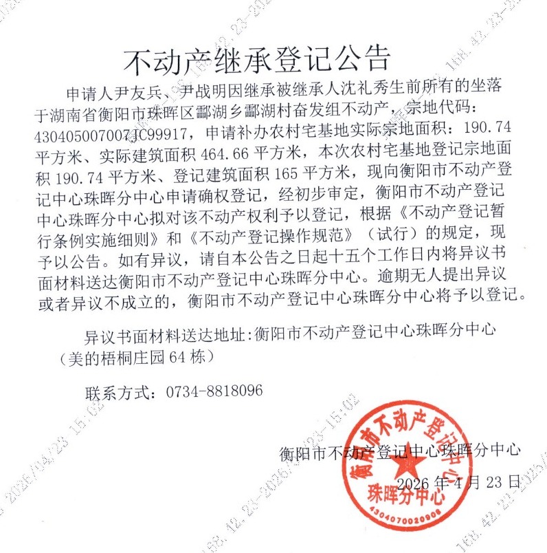 关于尹友兵、尹战明继承沈礼秀不动产的公告