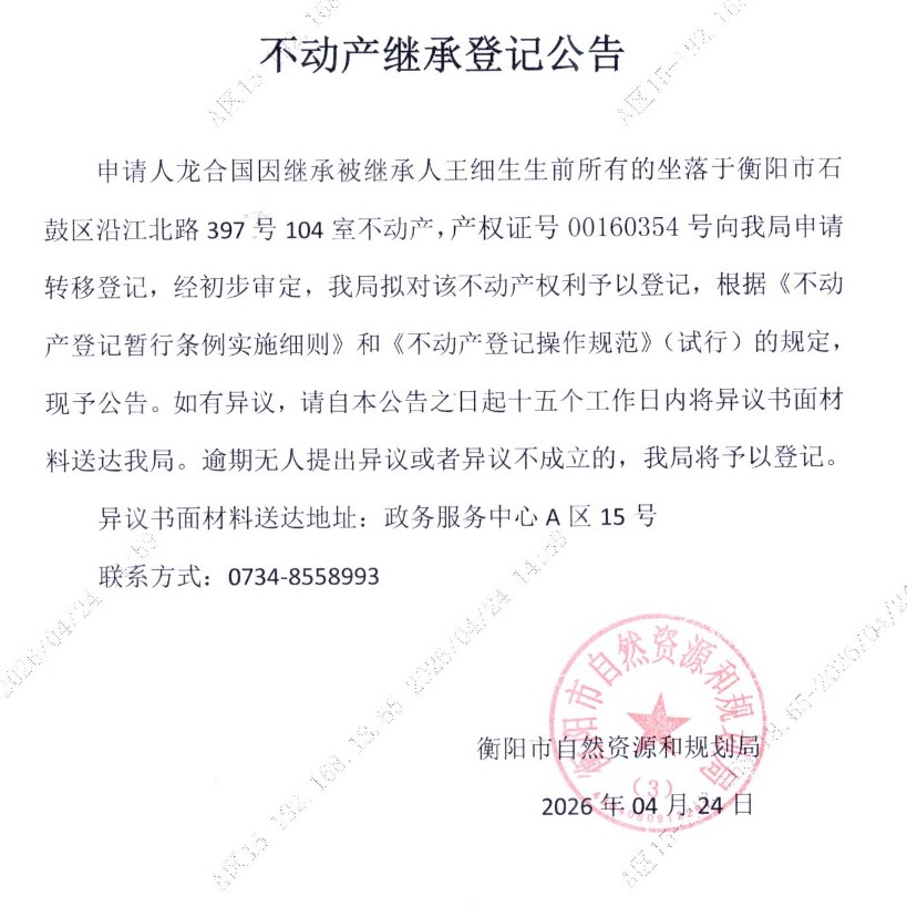 关于龙合国继承王细生不动产登记的公告