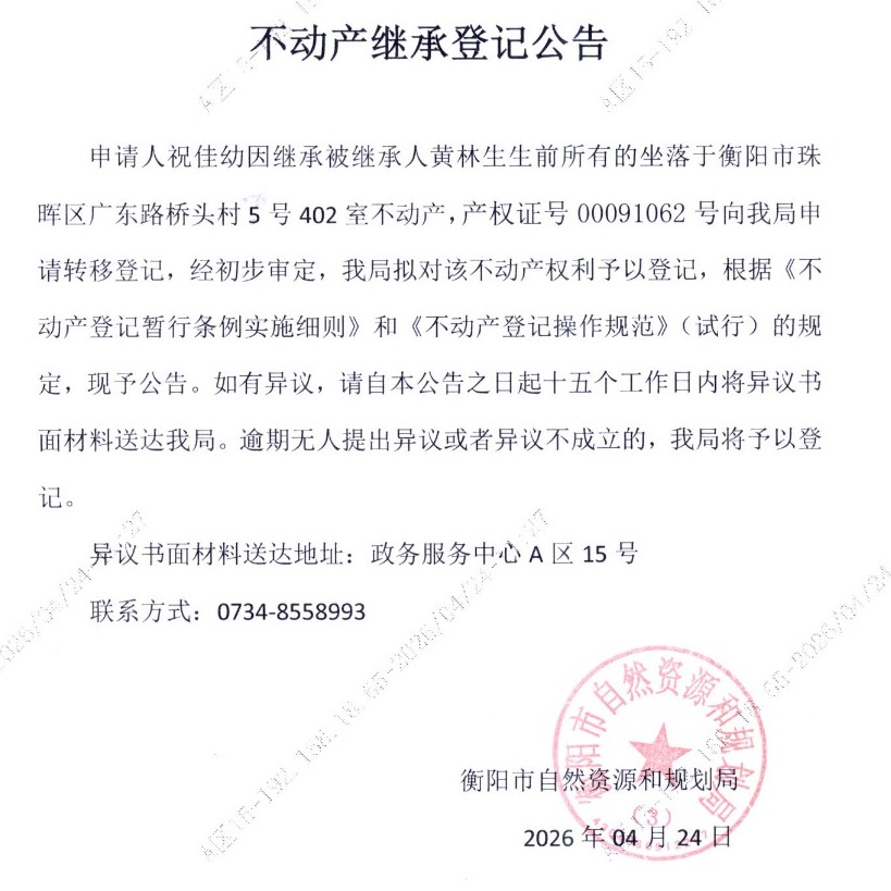 关于祝佳幼继承黄林生不动产登记的公告