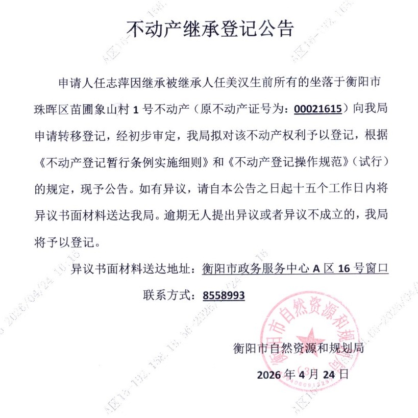 关于任志萍继承任美汉不动产登记的公告