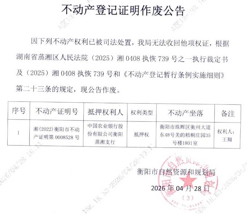 关于中国农业银行股份有限公司衡阳蒸湘支行不动产登记证明作废公告