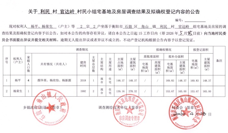 关于利民村官达岭村民小组宅基地及房屋调查结果及拟确权登记内容的公告