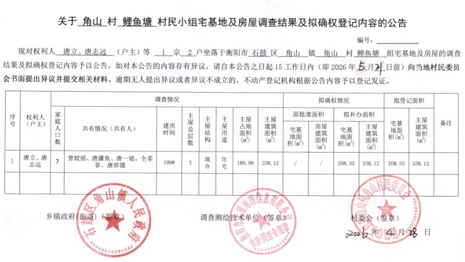 关于角山村鲤鱼塘村民小组宅基地及房屋调查结果及拟确权登记内容的公告