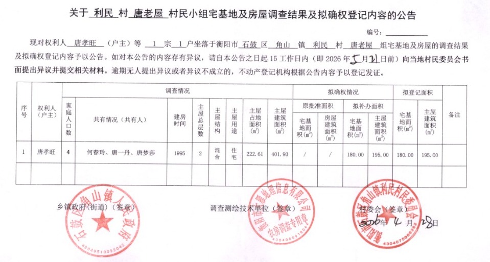 关于利民村唐老屋村民小组宅基地及房屋调查结果及拟确权登记内容的公告