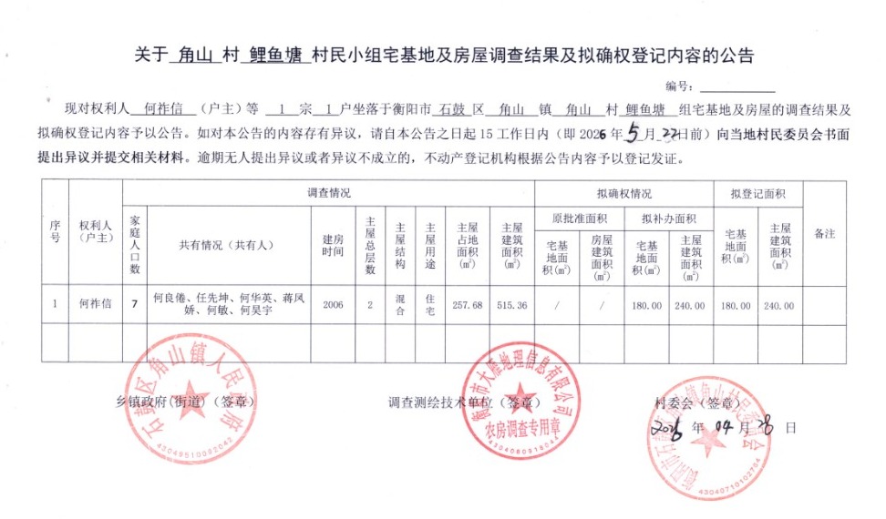 关于角山村鲤鱼塘村民小组宅基地及房屋调查结果及拟确权登记内容的公告