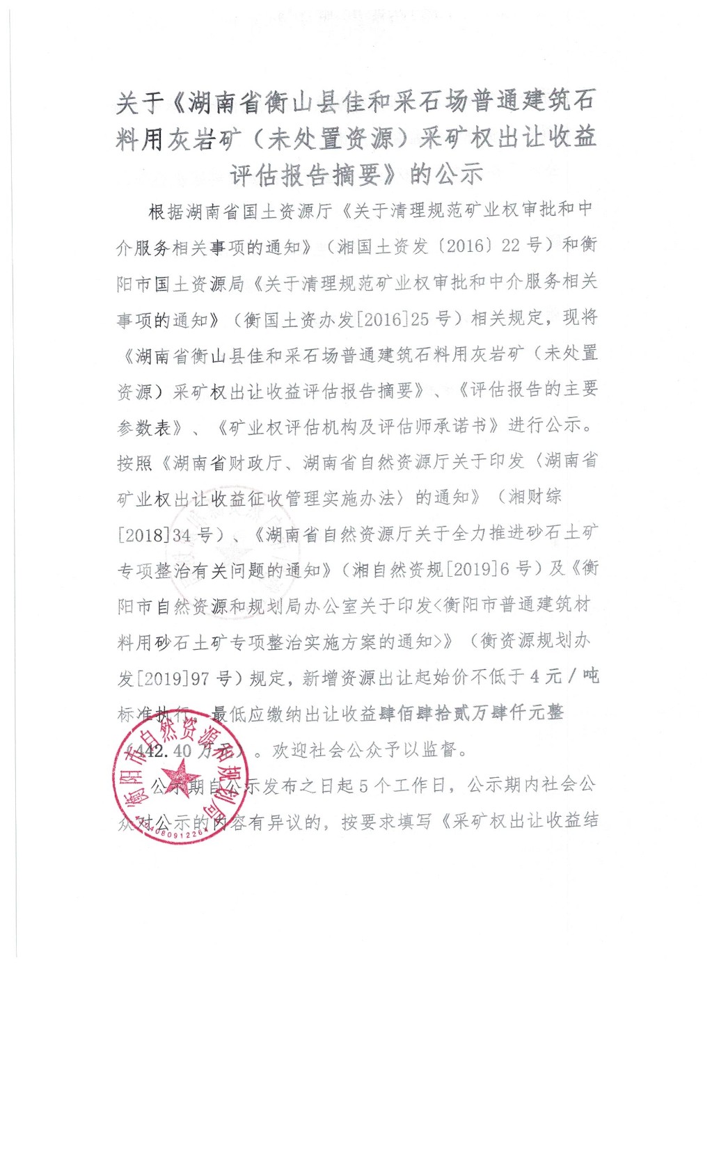衡山县佳和灰岩矿采矿权出让收益评估报告摘要